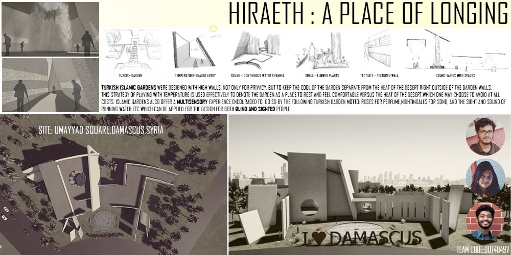 We designed a place for the people of Syria, a country that is devastated by wars. A lot of people lose their eyesight in the wars. We chose the design methods as in Turkish Isalmic Garden. A garden, where you’ll need 4 of the other senses other than visualization. Sense of temperature, Sound, smell and touch. As one enters the place, he can easily sense welcoming reception from the change of temperature from the outside. Feeling the mystic of the place and then murmuring sound of running water gives direction where the path leads. The adjacent garden, filled with fragrant flower plants gives hints of its presence. Garden is oriented as per the wind flows. While the whole multi sensory architectural setup will help the blind people to move on their own,The aesthetic setup will bring peace in the sighted people’s mind.
